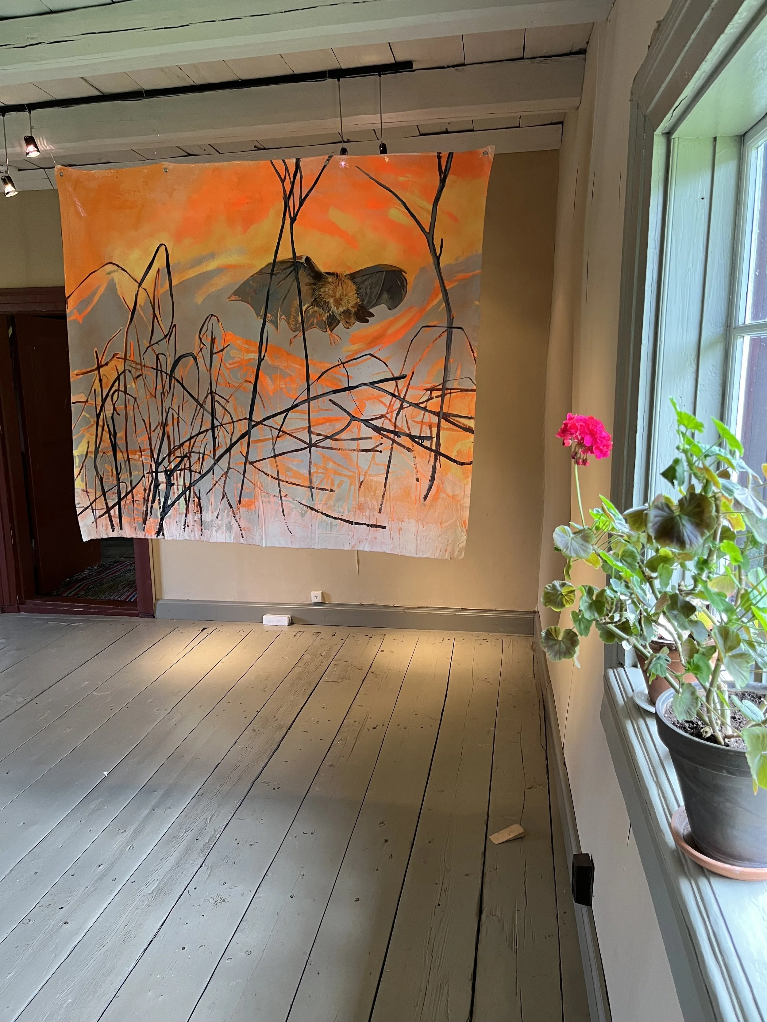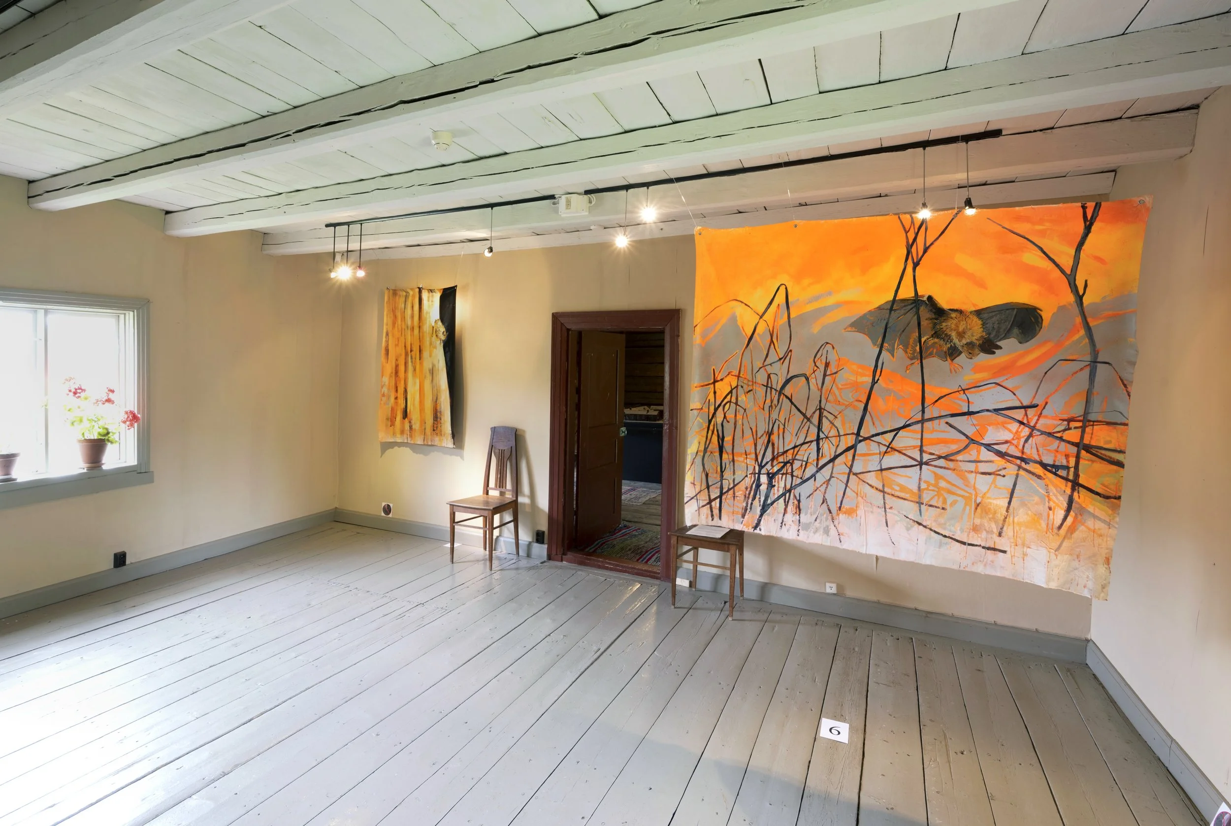 Shadow Fliers comprises a series of large-scale, acrylic on muslin paintings and an accompanying narrative. The work was created for and originally installed in the historic buildings at the Nautelankoski Museum in Lieto, Finland.